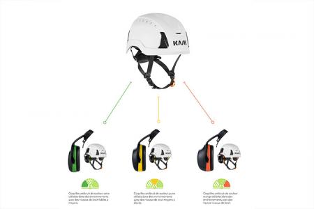 Kask a lancé une gamme complète de protections auditives intégrables à tous ses casques. La gamme propose trois modèles distincts, identifiés par couleur et adaptés à des niveaux sonores spécifiques :